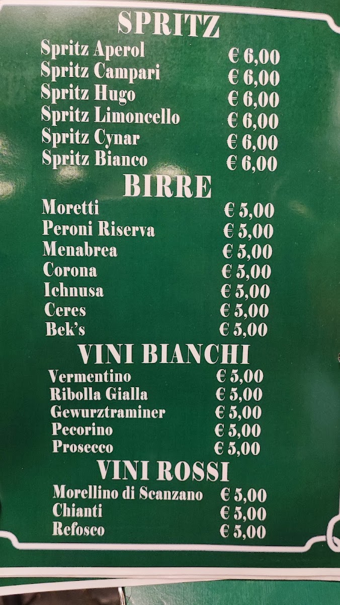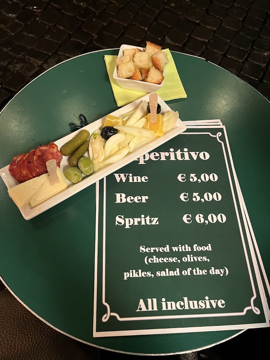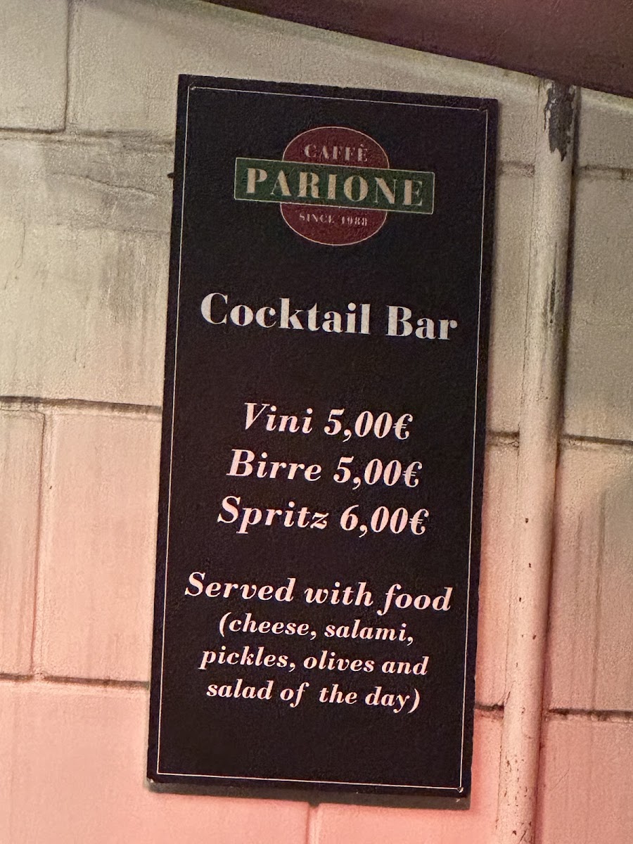 Nestled in the heart of Rome on Via della Pace, Caffe Parione is a charming café and bar that excels in the art of aperitivo. The menu showcases an impressive range of drinks, with the Aperol Spritz taking center stage at an inviting price of just €6. Each drink is accompanied by a delightful assortment of complimentary snacks, including chips, cheese, olives, salad, pickles, and cured meats, elevating the experience beyond the ordinary.